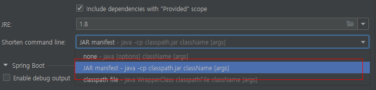 만약, 위 방법으로도 똑같은 오류가 발생하면, 아래 그림과 같이 "Shorten command line" 부분을 "JAR manifest" 로 변경 후 다시 Build 하면 정상적으로 되는 것을 확인 할 수 있다.