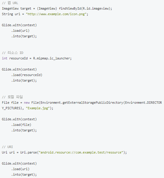 - load(String imageUrl) : 웹 상에서의 이미지 URL or 안드로이드 리소스 ID or 로컬 파일 or URI