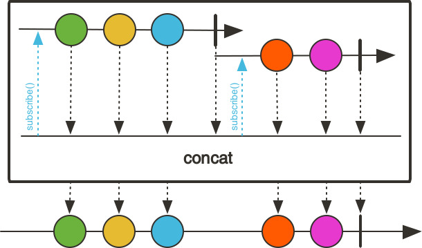 Concatenation is achieved by sequentially subscribing to the first source then waiting for it to complete before subscribing to the next, and so on until the last source completes. Any error interrupts the sequence immediately and is forwarded downstream.