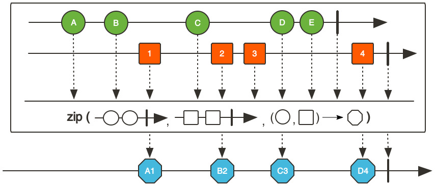 zip() 은 여러 스트림을 병렬로 결합하여 각 스트림의 동일한 순서에 있는 요소들을 결합한다. 각 스트림의 같은 인덱스에 위치한 요소들을 결합하며, 스트림 중 하나라도 완료 되면 그 시점에서 결합을 멈춘다. 결과 값은 각 스트림의 각 요소들이 튜플 형식으로 결합되어 방출 된다